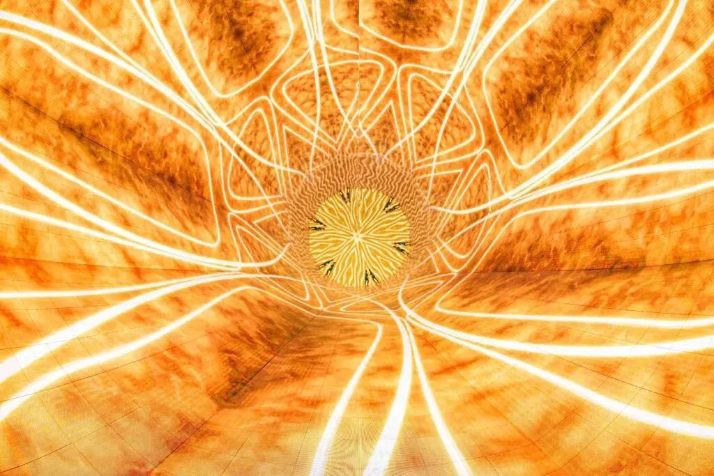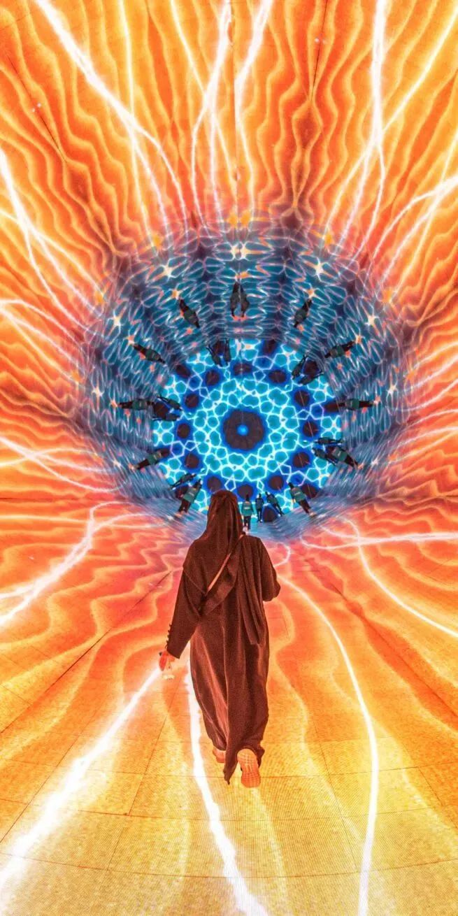 在沙特阿拉伯的年度盛會(huì)上,英國創(chuàng)作團(tuán)隊(duì)stufishstudio帶來一件大型沉浸式光影裝置——世界上最大的萬花筒,作品的靈感來自沙特阿拉伯的自然地理分層和阿拉伯半島上空的星空,整個(gè)裝置長40m,高 6m,寬 3m,是世界上同類產(chǎn)品中最大的,采用無縫且無翹曲的鏡面設(shè)計(jì),以實(shí)現(xiàn)空間無限延展的效果。