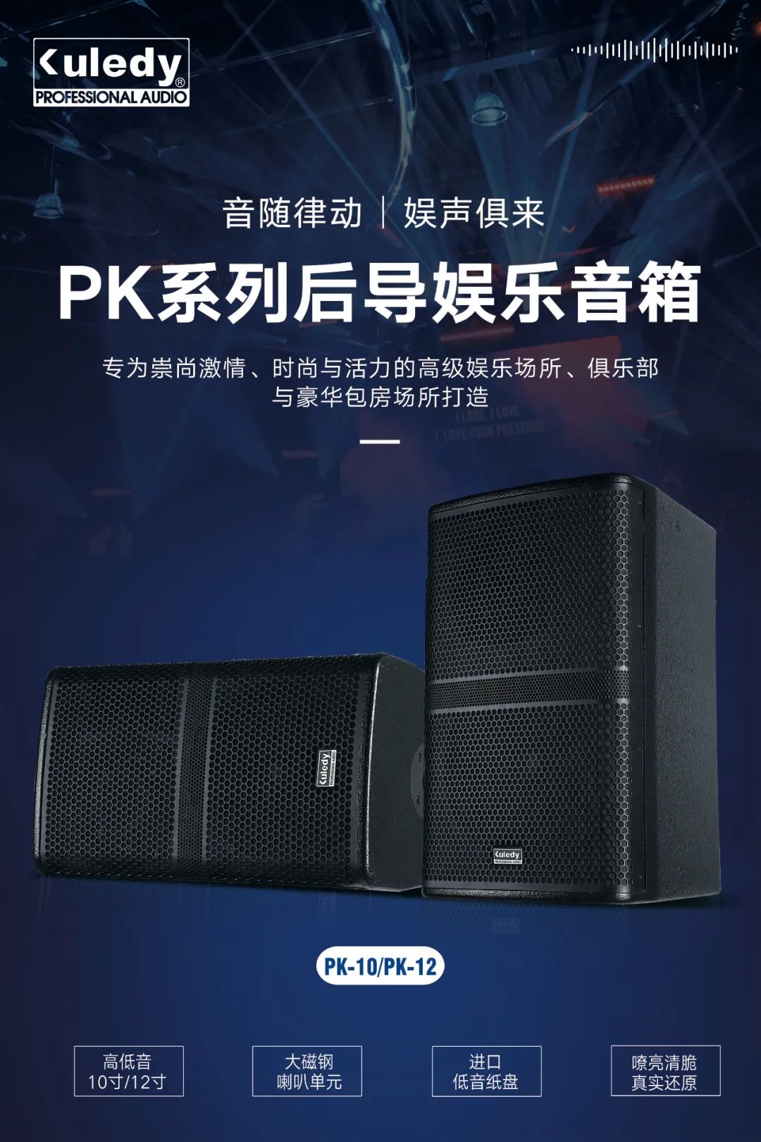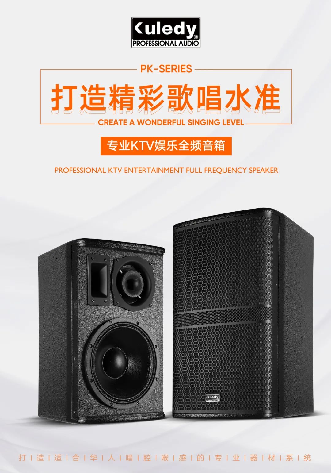 PK系列后導(dǎo)娛樂音箱,精確的指向性能有效降低房間內(nèi)的嘯叫情況,超級強勁的低頻營造出寬闊的立體感聲場,清晰細膩的中高音頻更能突顯出人聲的磁性渾厚的效果,搭配MA系列功放、DSP系列效果器、MC-8800專業(yè)無線話筒,打造一個重低音震撼環(huán)繞的高音質(zhì)嗨歌現(xiàn)場,完美打造精彩歌唱水準現(xiàn)場!