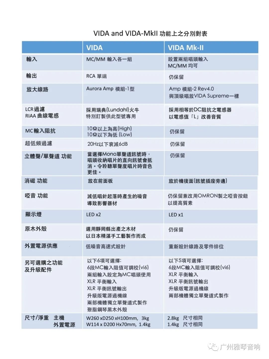 VIDA MKII與上一代一樣,亦有如多段輸入阻抗調(diào)節(jié)、4段輸入容抗阻值選擇、平衡XLR輸入/輸出...等之特定功能附加可供訂購(gòu),讓用家有更多的彈性來(lái)挑選出適合自己需要的唱放配能配套。