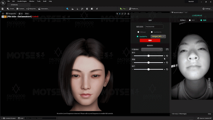 去年底,F(xiàn)ACEGOOD發(fā)布了高精度實時面部捕捉技術(shù):Seattle Pro,當即公布了論文,同時面向全球創(chuàng)作者招募Beta測試。MOTSE墨子團隊成為FACEGOOD最終選擇的合作伙伴,作為國家高新技術(shù)企業(yè),團隊提供數(shù)字藝術(shù)相關(guān)全案解決服務(wù)。通過一個月的技術(shù)磨合與測試過程、技術(shù)開發(fā)與藝術(shù)審美匹配,MOTSE墨子團隊研制了自動綁定流程并跑通Seattle Pro,成功進行落地驗證,可以實現(xiàn)高精度實時表情捕捉,100%還原。
