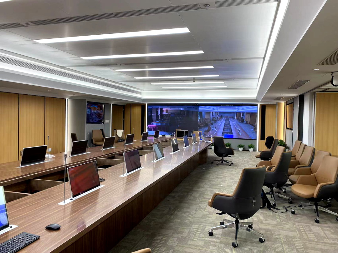會議室采用視通科技自主研發(fā)的4K分布式KVM坐席拼控系統(tǒng),進行統(tǒng)一音視頻調度,實現(xiàn)各區(qū)域信息調取、顯控、視頻會議,環(huán)境控制,滿足各區(qū)域互聯(lián)互通、靈活交互,為協(xié)同管控提供強有力的信息化支撐。