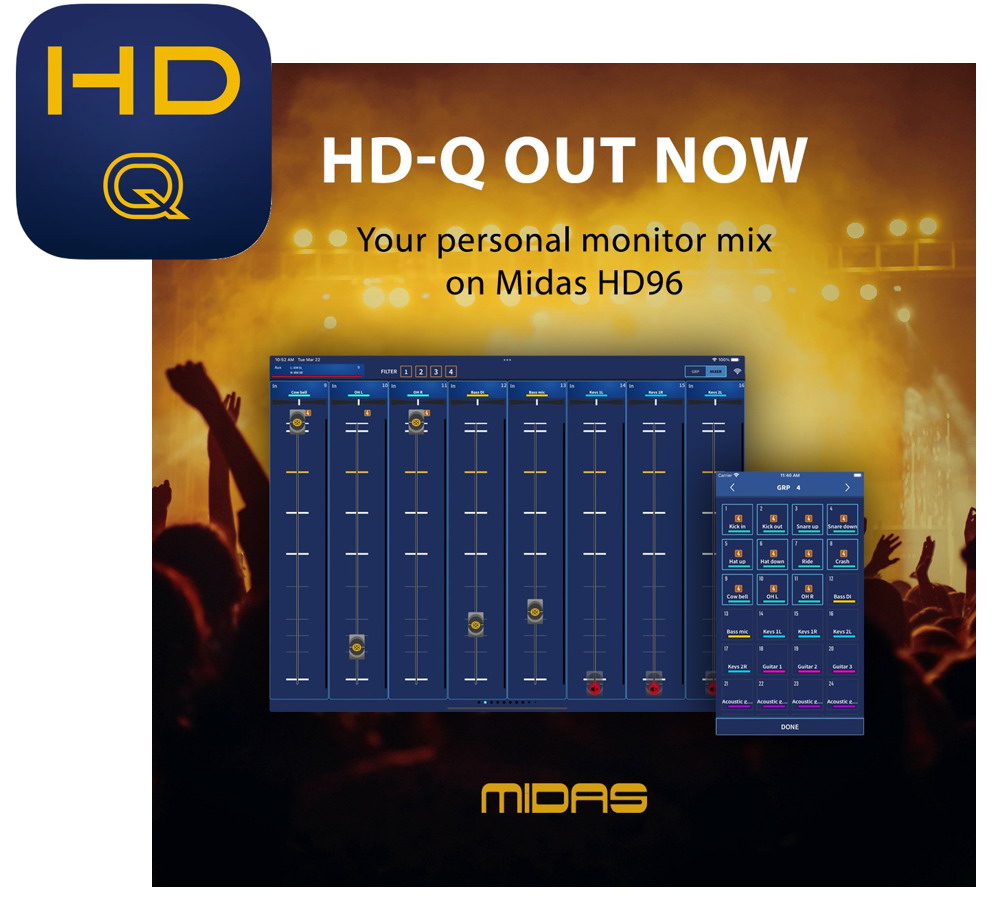 同樣,MIDAS現(xiàn)已推出HD96-24的遠程控制軟件——HD-Q。目前它是一款iOS應(yīng)用程序,可用于控制HD96-24的個人混音。借助HD-Q,調(diào)音師可以控制自己的監(jiān)聽混音(單聲道/立體聲),并單獨完全訪問所有輸入通道;且輸入也可以組合成4組之一以進行可變相對控制。目前支持的設(shè)備有:iPhone、iPad、iPod touch、Mac。