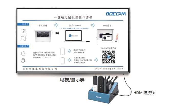 1. 將投屏接收主機通過HDMI與顯示屏連接,再接通電源。 手機連接投屏器WiFi(用戶名:ESHOW-XXXXXX,初始密碼:12345678)