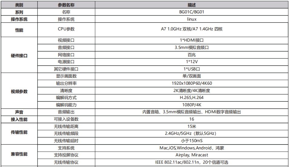 高清畫質(zhì),流暢穩(wěn)定BG01系列設備采用linux系統(tǒng),瑞芯微多媒體芯片,最大可支持4K60輸出顯示。持續(xù)24小時穩(wěn)定運行,畫面清晰流暢不卡頓。內(nèi)置2.4/5G雙頻WIFI模塊,抗干擾能力強,支持15米投屏,充分滿足中小型會議室,家庭娛樂等無線投屏需求。