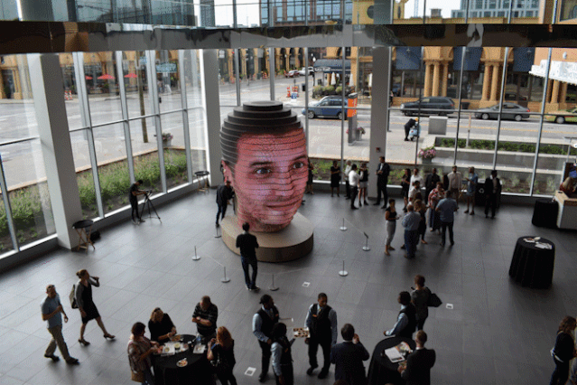 這座位于美國哥倫布市會議中心知名的3D人頭面部雕塑,是一副名為“As We Are”的藝術(shù)雕塑。其設(shè)計的初衷是作為一款具有互動性的社交工具,體驗者的面部可以在雕塑上“復(fù)刻”并展示,趣味無窮。