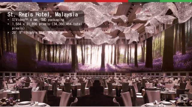 馬來西亞的吉隆坡瑞吉酒店是世界馳名的高檔酒店之一,上海三思為其定制了總面積近600㎡的大型室內(nèi)全彩小點間距LED顯示屏,兩側(cè)的44塊屏均由導(dǎo)軌系統(tǒng)支撐,可實現(xiàn)移動、折疊等。超4K的高清效果,為客戶帶來耳目一新的視聽享受。