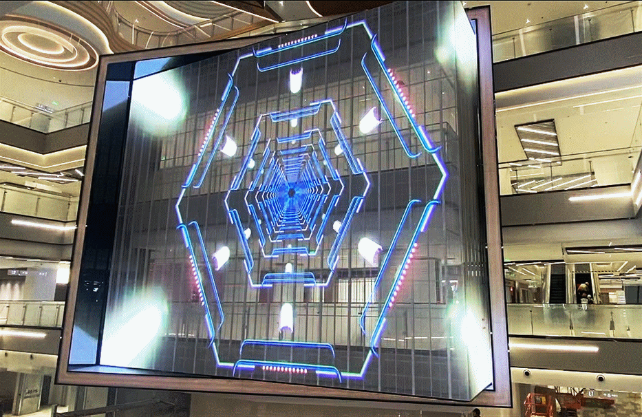 在溫州印象城MEGA主題購物區(qū)上方,有一面形似玻璃的巨大屏幕,這是三思為印象城定制的近200㎡拐角室內(nèi)全彩透明屏。