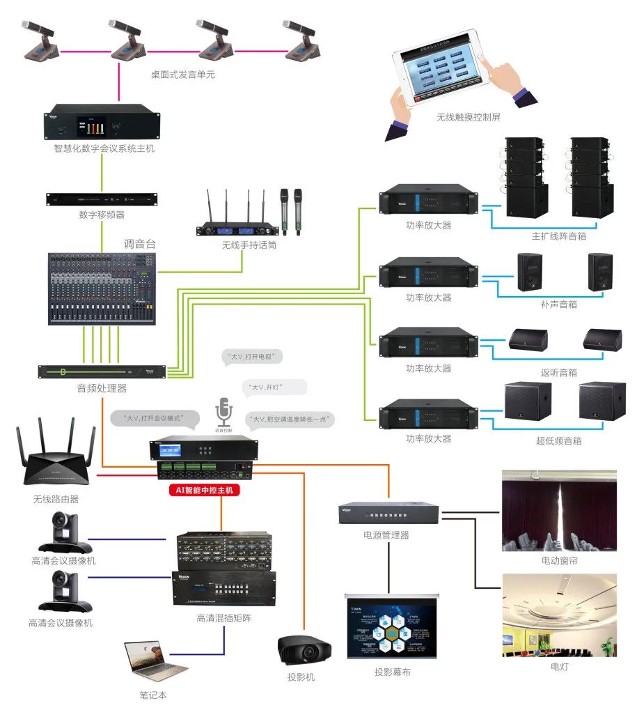 VOKON安裝在會(huì)議室會(huì)場(chǎng)前、中、后位置,整個(gè)聲場(chǎng)效果完美,中高頻覆蓋全面,清晰悅耳,低頻震撼有力。