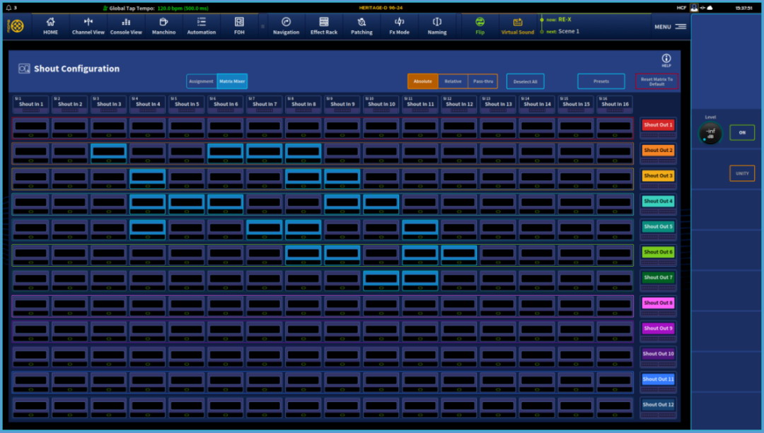 03 另外,它的Shout內(nèi)通模式配置可實(shí)現(xiàn)16×12的矩陣混音,該功能可用于舞臺(tái)工作人員的內(nèi)部通訊,亦或者舞臺(tái)監(jiān)聽系統(tǒng),并不會(huì)占用常規(guī)的處理通道。這樣能做到任意混合發(fā)送、路由配置信號(hào)、存儲(chǔ)/調(diào)用預(yù)設(shè)快速部署等等,從而簡化現(xiàn)場和轉(zhuǎn)播音頻工程師的工作。