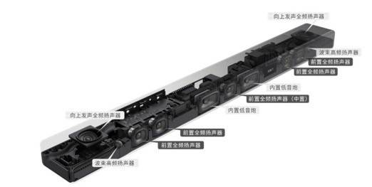 HT-A7000使用索尼的空間平衡揚(yáng)聲器單元,因?yàn)榛匾舯隗w積受限,能使用的單元振膜面積越小,越難產(chǎn)生高聲壓。在空間平衡揚(yáng)聲器單元中,振膜的形狀接近圓角矩形,有效面積更大,邊緣壓印的圖案在保持振幅平衡的同時(shí),還能進(jìn)一步減少輕微失真,增強(qiáng)聲音的真實(shí)感。向上發(fā)聲揚(yáng)聲器單元帶有一定的傾角,可以讓有高度的聲音通過(guò)天花板的反射傳達(dá)到聆聽(tīng)者的耳中,從而提升聲音的高度感。