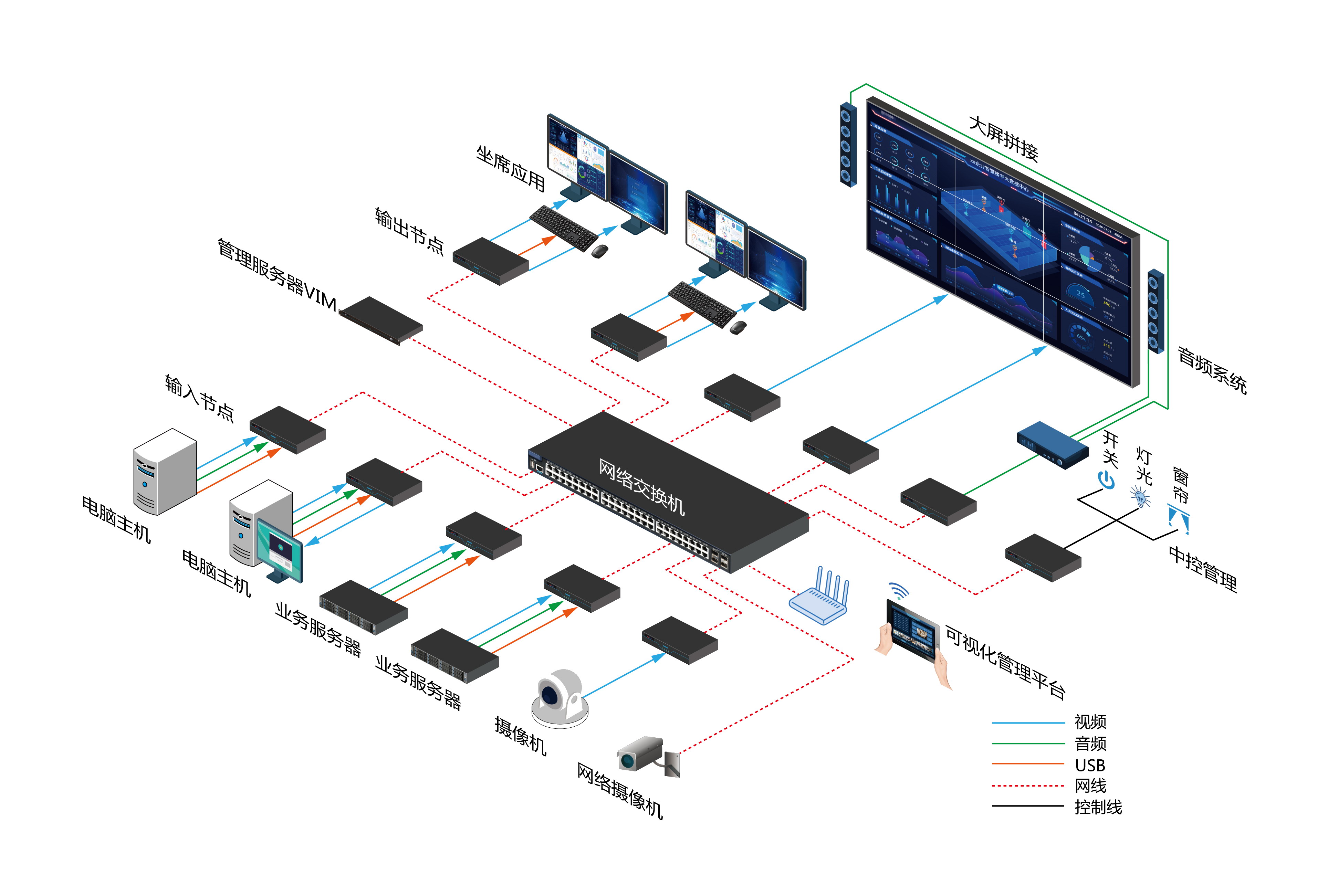 l 可視化系統(tǒng)管理:提供場景預(yù)案管理、視頻切換管理、大屏拼控管理、錄播管理、視頻交互管理、音頻管理、環(huán)境中控管理、設(shè)備系統(tǒng)狀態(tài)管理、系統(tǒng)配置管理等功能于一體。