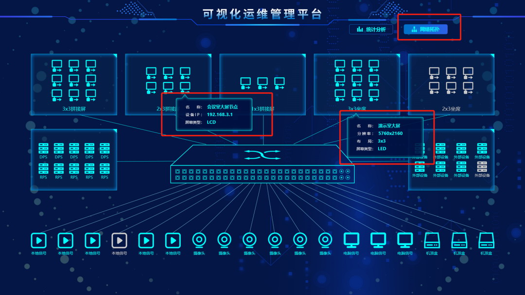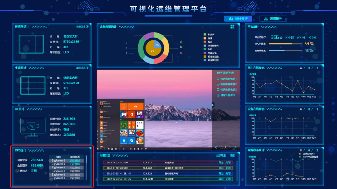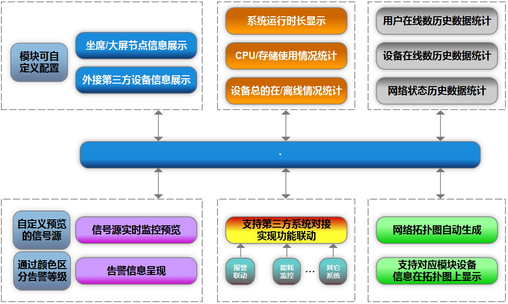 可視化運(yùn)維管理平臺(tái)集拼接屏/坐席統(tǒng)計(jì)、編碼輸入統(tǒng)計(jì)、KVM輸入統(tǒng)計(jì)、UT統(tǒng)計(jì)、DPS統(tǒng)計(jì)、平臺(tái)統(tǒng)計(jì)、用戶在線狀態(tài)、設(shè)備在線狀態(tài)、網(wǎng)絡(luò)狀態(tài)統(tǒng)計(jì)、設(shè)備類型統(tǒng)計(jì)、反監(jiān)預(yù)覽功能、告警信息欄、自動(dòng)生成網(wǎng)絡(luò)拓?fù)鋱D等功能于一體,可以直觀的展現(xiàn)系統(tǒng)中對(duì)應(yīng)設(shè)備的相關(guān)信息。