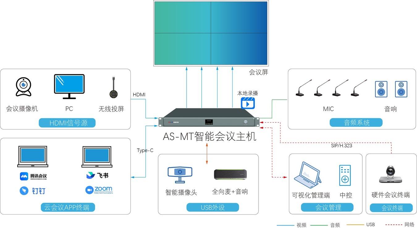 MT主機通過Type-C或USB連接使用騰訊會議/ZOOM/釘釘?shù)钠桨寤螂娔X,讓云視頻會議自由共享會議室中所有音視頻信號,輕松實現(xiàn)云端擴展。