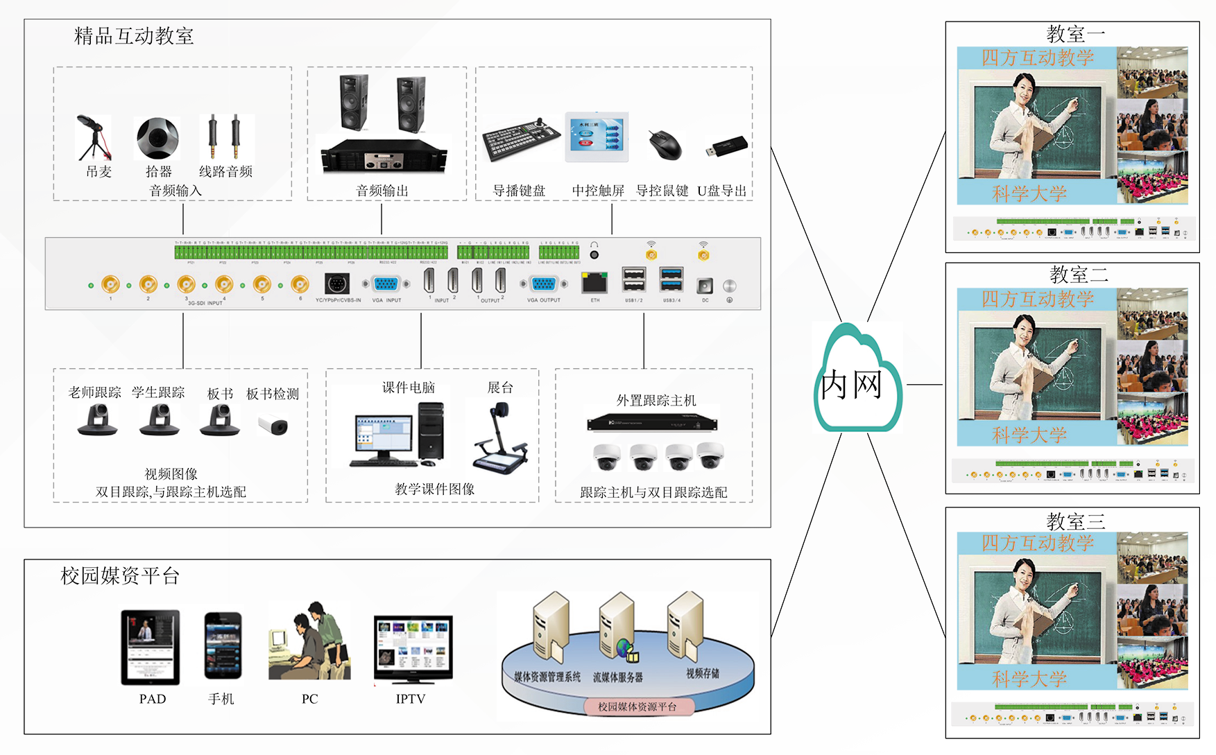 高清嵌入式一體化智能錄播系統(tǒng)包括了音視頻采集系統(tǒng)、自動(dòng)跟蹤系統(tǒng)、自動(dòng)導(dǎo)播系統(tǒng)、課程錄制系統(tǒng)、網(wǎng)絡(luò)直播系統(tǒng)等,各個(gè)子系統(tǒng)協(xié)同工作,實(shí)現(xiàn)課件錄制、直播、點(diǎn)播、攝像智能跟蹤定位、智能導(dǎo)播等功能模塊。一體化智能錄播系統(tǒng)支持多路高清視頻源同步錄制,同時(shí)可以通過網(wǎng)絡(luò)同步直播課件、提供學(xué)生課后學(xué)習(xí)、復(fù)習(xí),而且為后期老師聽課評課,提供了很好的課件資源。另外,通過資源管理平臺,可以很好的解決教學(xué)以及管理中的時(shí)間、空間、課件長期安全保存以及網(wǎng)上點(diǎn)播、重復(fù)利用等實(shí)際問題。