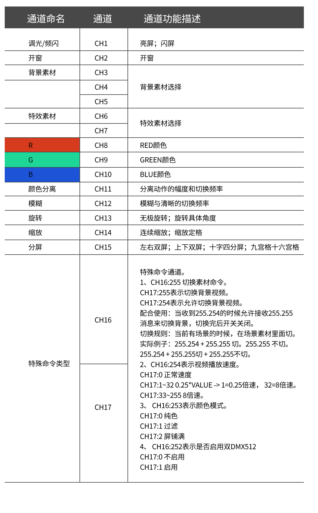 通過512協(xié)議,響應(yīng)智控發(fā)送的通道碼,用以實(shí)現(xiàn)根據(jù)包廂場(chǎng)景、歌曲類型不同,切換預(yù)先編排好的素材場(chǎng)景。實(shí)現(xiàn)智能聯(lián)動(dòng),無需手動(dòng)操作。