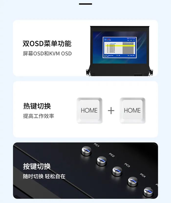 KVM切換器的身影常出現(xiàn)在機房管理及數(shù)據(jù)中心等場景中,僅用一套鍵鼠顯就能控制多臺主機。