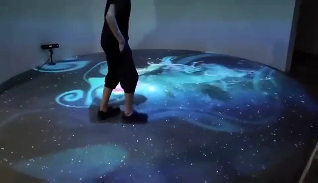 地面互動投影系統(tǒng)多采用頂部懸掛投影設(shè)備的方式,把影像效果投射到地面,當人走至投影區(qū)域時,通過互動系統(tǒng)識別,與投影的畫面進行交互。