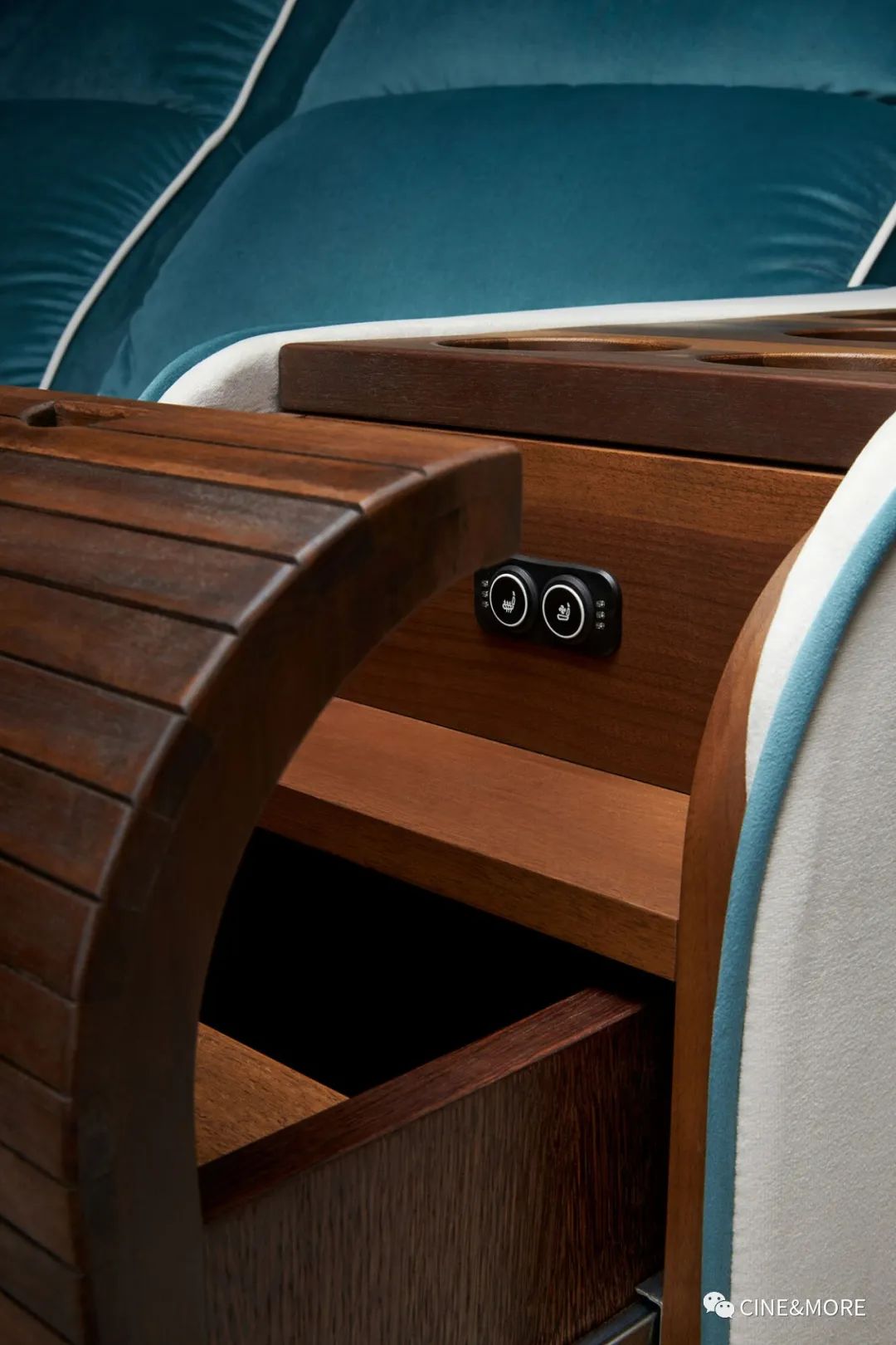 彎曲的超寬中間扶手由深色美國胡桃木制成,托盤、不同深度的多個杯架和一體式拉出的抽屜式大儲物格,一伸手“小吃吧”就在你身旁。