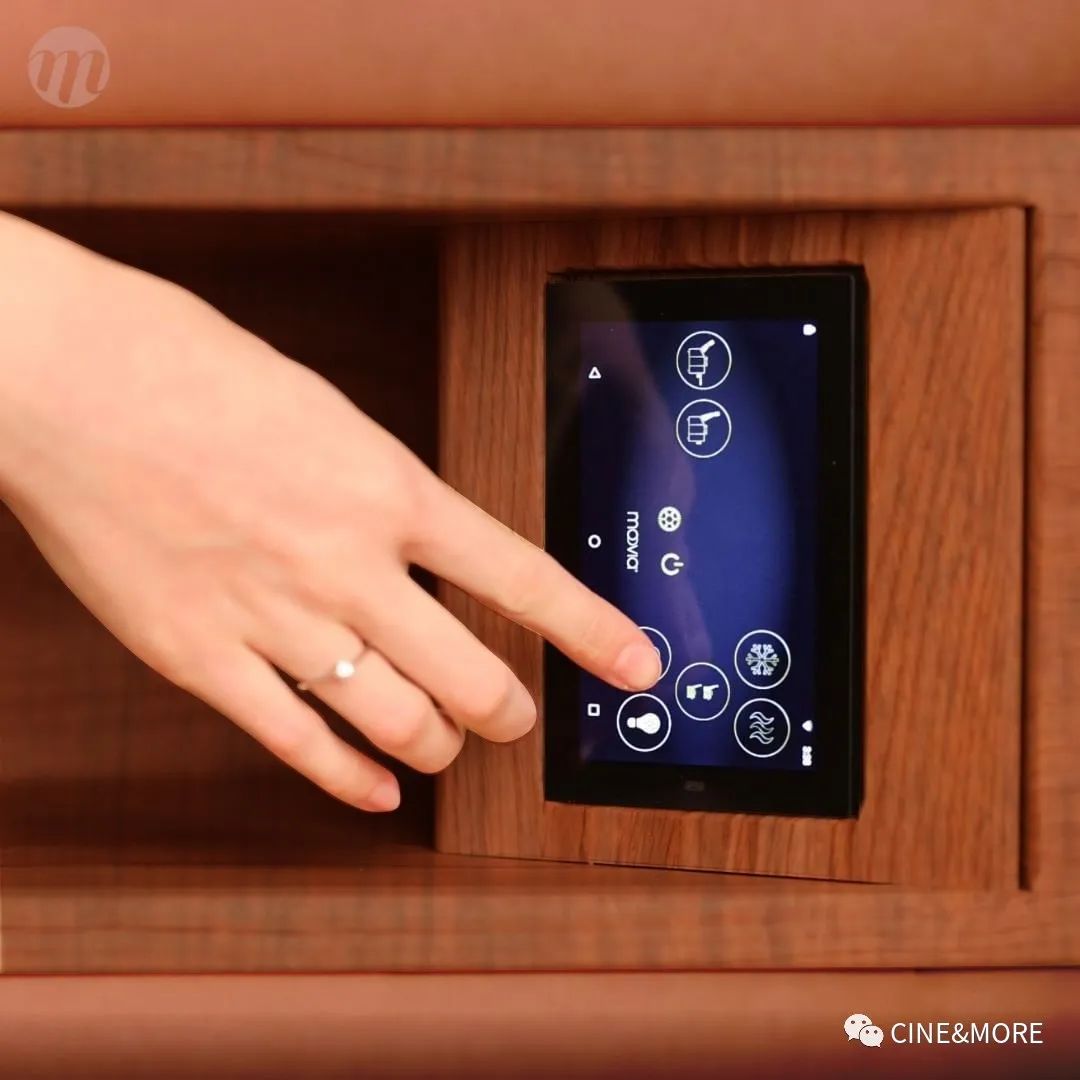 當然,也不僅限于此,扶手處還可配置QI手機無線充電器,扶手儲物箱內(nèi)可嵌入智能面板,可接入快思聰、Control4和Savant等家庭自動化系統(tǒng)——在家庭影院里的所有功能,你躺在舒適的影院沙發(fā)上,就能一手掌控。