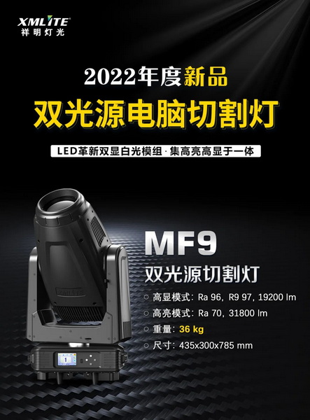 雙光源切割燈MF9 采用一個(gè)裝載兩組800W LED光源的模組,一個(gè)光源散熱器,一個(gè)光源驅(qū)動(dòng)器通過(guò)繼電器切換分別驅(qū)動(dòng),高亮模式輸出時(shí)Ra70,燈具輸出光通量:31800lm,高顯模式時(shí)Ra:96、R9:97,燈具輸出光通量:19200lm,出光角度:5-52°線性可調(diào),四片式全程圖形切割模塊,切割圖形可180°旋轉(zhuǎn),產(chǎn)品尺寸:435x300x785 mm(小)、凈重:36 kg(輕)。