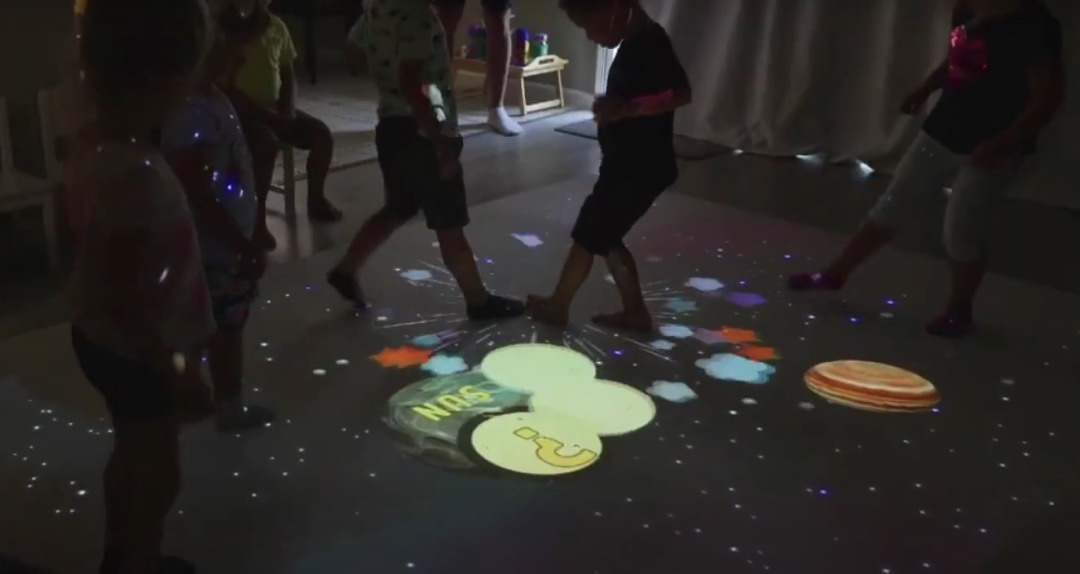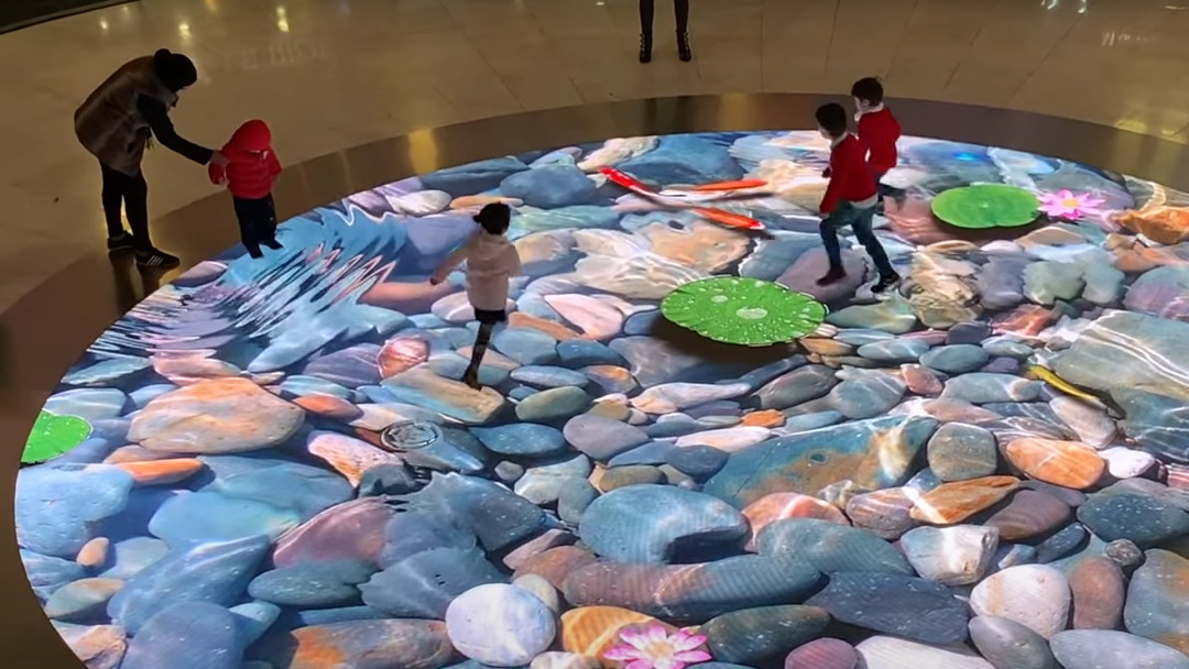 地面互動(dòng)的效果有很多,比如投影的是水面,人踩上去有水紋波、水里有魚(yú),人踩上去的時(shí)候魚(yú)兒會(huì)游開(kāi)、又比如人踩的地方花會(huì)綻放等。