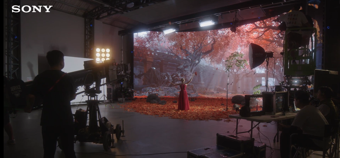 最新發(fā)布的《索尼電視 身臨其境》廣告片中展示了看體育、看電影、玩游戲三個常見的電視使用場景,畫面中自行車選手在蔥郁山野間穿梭飛馳,紅裙少女在紛飛落葉中肆意起舞,豪華賽車在賽博朋克夜景里引擎轟鳴,虛擬與現(xiàn)實交替,仿若身臨其境。而這樣令人震撼的視頻,僅僅是在棚內(nèi)使用虛擬拍攝完成的。索尼電視一直致力于讓消費者通過電視的屏幕與揚聲器系統(tǒng),無論是觀看電影,還是暢玩游戲,都能夠沉浸其中,充分地感受創(chuàng)作者的意圖。為了更好地展現(xiàn)這種“沉浸感”理念,索尼電視首次嘗試采用虛擬拍攝的方式完成廣告片的創(chuàng)作,并選擇了索尼·觀池黑彩晶虛擬制作影棚作為拍攝場地。
