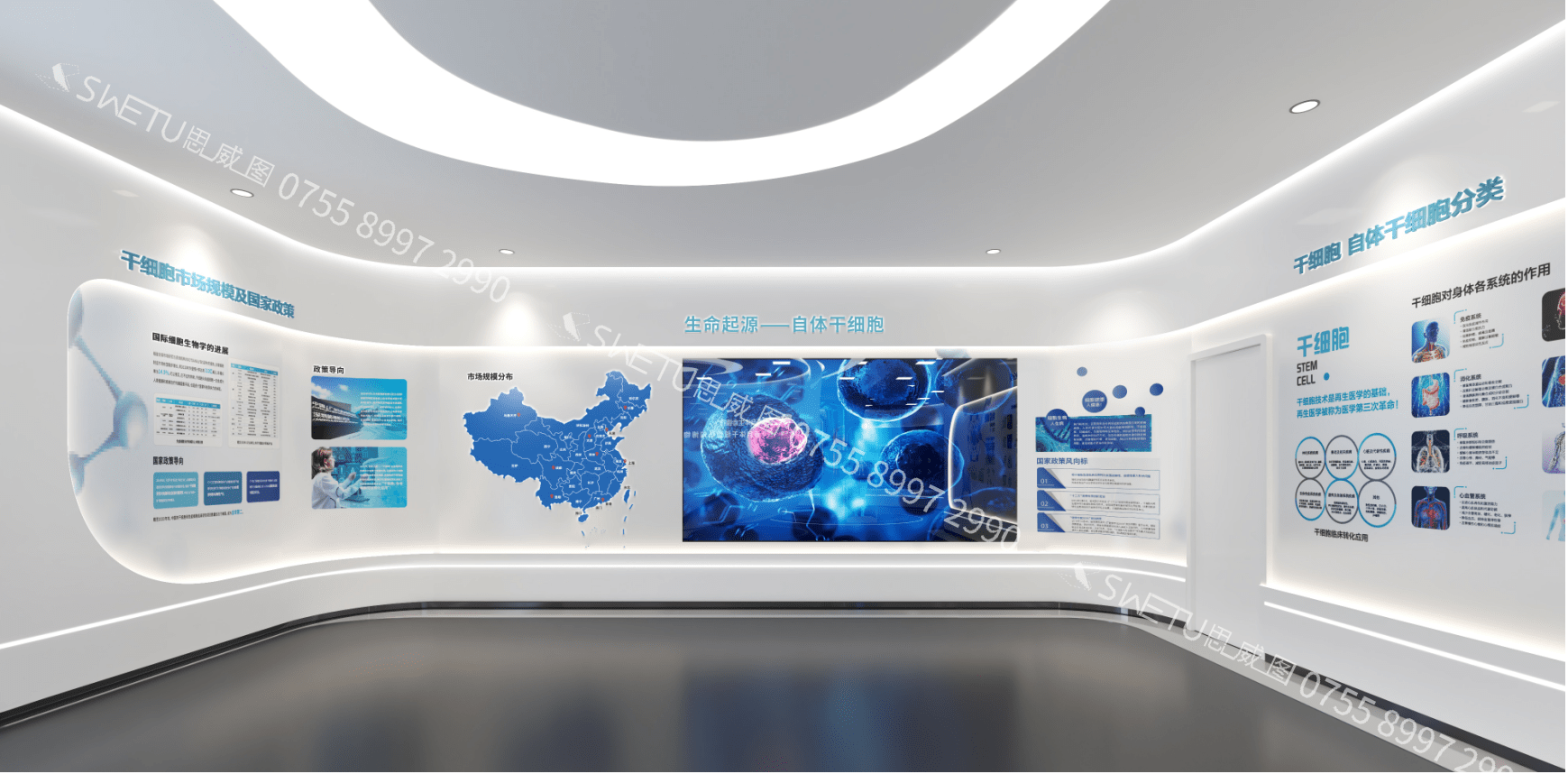 5、視覺效果與色彩設(shè)計(jì):科普館的視覺效果應(yīng)突出,使用吸引人的色彩和照明,以及具有沖擊力的展品和多媒體展示。例如,可以通過LED屏幕展示干細(xì)胞的3D圖像,以及干細(xì)胞研究的最新成果等。同時(shí),合理的色彩搭配和照明設(shè)計(jì)也能夠營造出舒適、專業(yè)的氛圍。