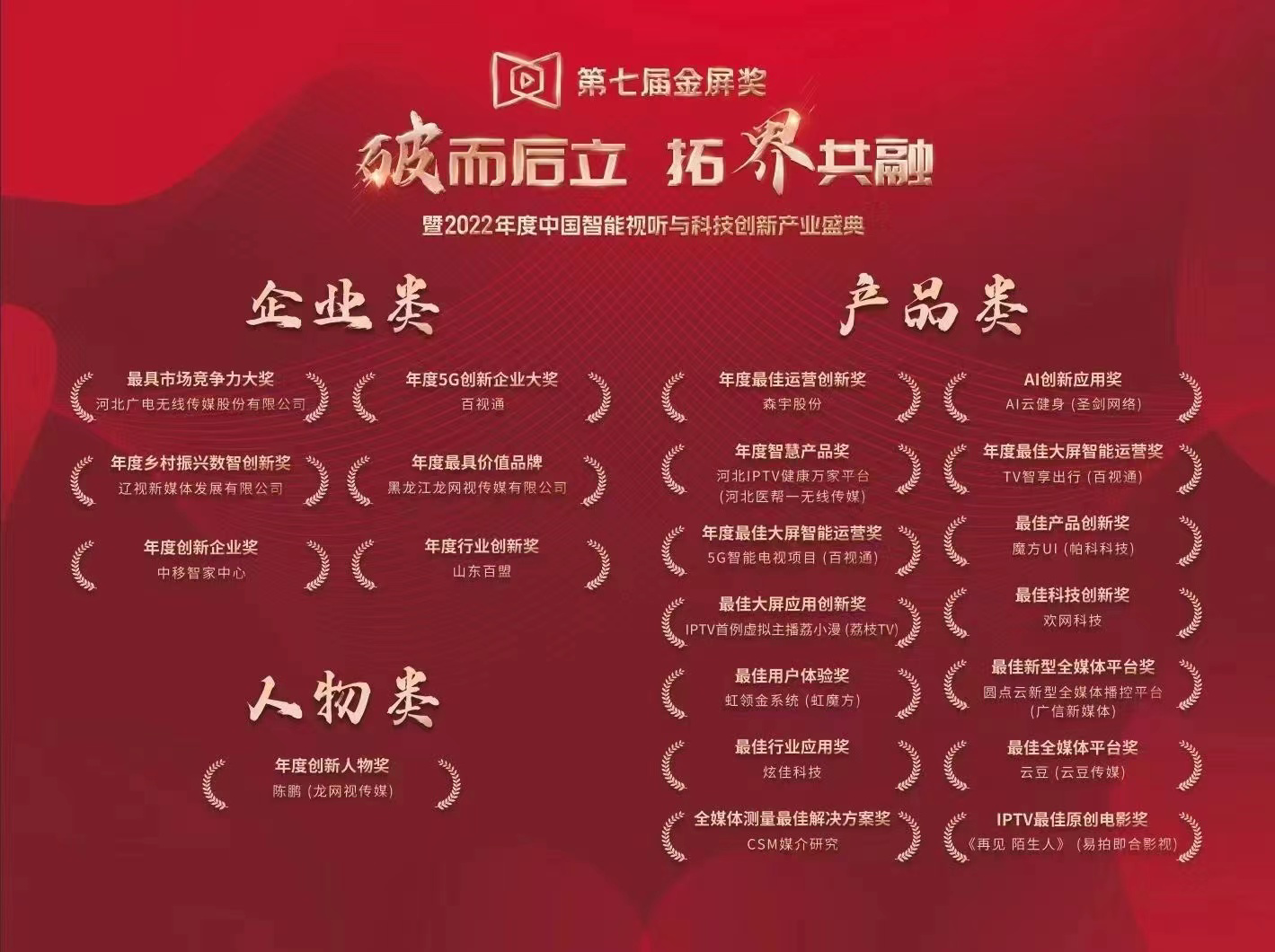 本屆金屏獎,共頒發(fā)了6個企業(yè)類獎項。河北無線傳媒榮獲“最具市場競爭力大獎”;百視通榮獲“年度5G創(chuàng)新企業(yè)大獎”;遼視新媒體榮獲“年度鄉(xiāng)村振興數(shù)智創(chuàng)新獎”;龍網(wǎng)視公司榮獲“年度最具價值品牌”;中移智家中心榮獲“年度創(chuàng)新企業(yè)獎”,山東百盟榮獲“年度行業(yè)創(chuàng)新獎”。