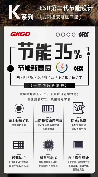 K系列本身就是節(jié)能環(huán)保產品,能適應惡劣的戶外應用環(huán)境;可支持24小時不間斷播放,滿足全時信息傳播的需要,防水,防雷,抗震都有卓越的性能。