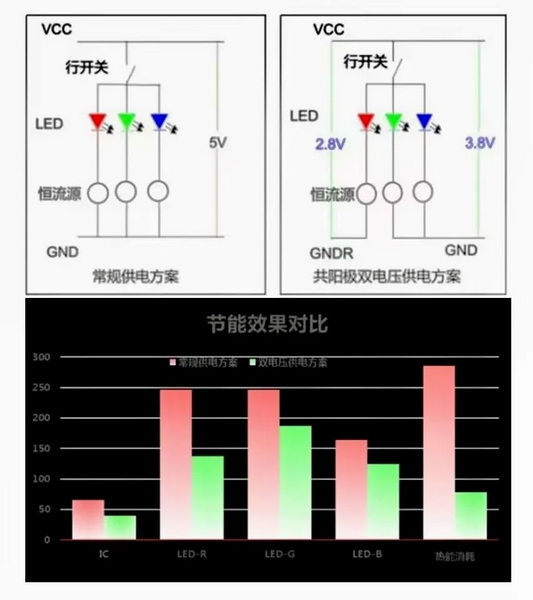 與傳統(tǒng)LED顯示屏供電方案不同,共陽極雙電壓節(jié)能顯示屏,紅光使用2.8V驅動,藍綠光使用3.8V驅動,兩路分開供電,相比傳統(tǒng)使用5V供電節(jié)能降耗效果顯著。