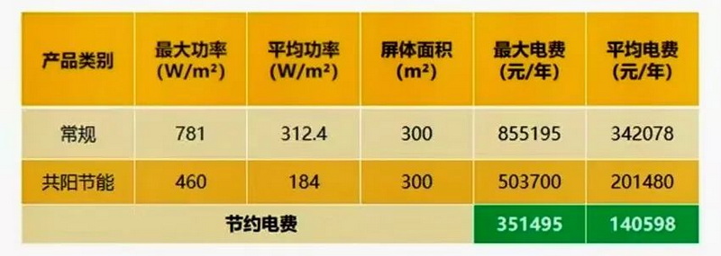 以GKGD-K8共陽極雙電壓節(jié)能屏每天工作10小時、商業(yè)電價1元/度為例,以300m顯示屏估算,年度平均電費可節(jié)約14.0598萬元,平均每張模組每年節(jié)約24元。
