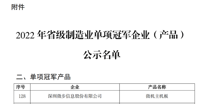 3月29日,廣東省工業(yè)和信息化廳發(fā)布《關(guān)于2022年省級(jí)制造業(yè)單項(xiàng)冠軍企業(yè)(產(chǎn)品)通過(guò)名單的公示》,根據(jù)公示名單,通過(guò)審核的單項(xiàng)冠軍示范企業(yè)有103家,單項(xiàng)冠軍產(chǎn)品有148個(gè)。微步信息榮登2022年省級(jí)制造業(yè)單項(xiàng)冠軍企業(yè)(產(chǎn)品)名單,微步信息微機(jī)主機(jī)板榮獲“單項(xiàng)冠軍產(chǎn)品”稱號(hào)。
