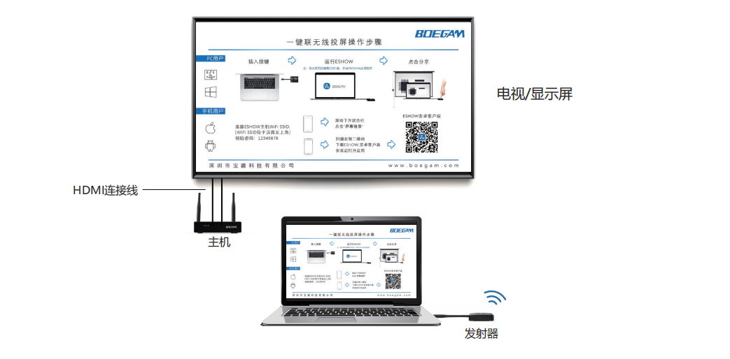 參考下圖先將投屏接收主機(jī)HDMI輸出端與顯示屏連接,再將電腦投屏發(fā)射器插入電腦USB接口,輕按發(fā)射器即可投屏。安卓手機(jī)或者平板可使用自帶的投屏功能或者下載APP投屏,蘋(píng)果手機(jī)或者平板使用屏幕鏡像即可投屏。