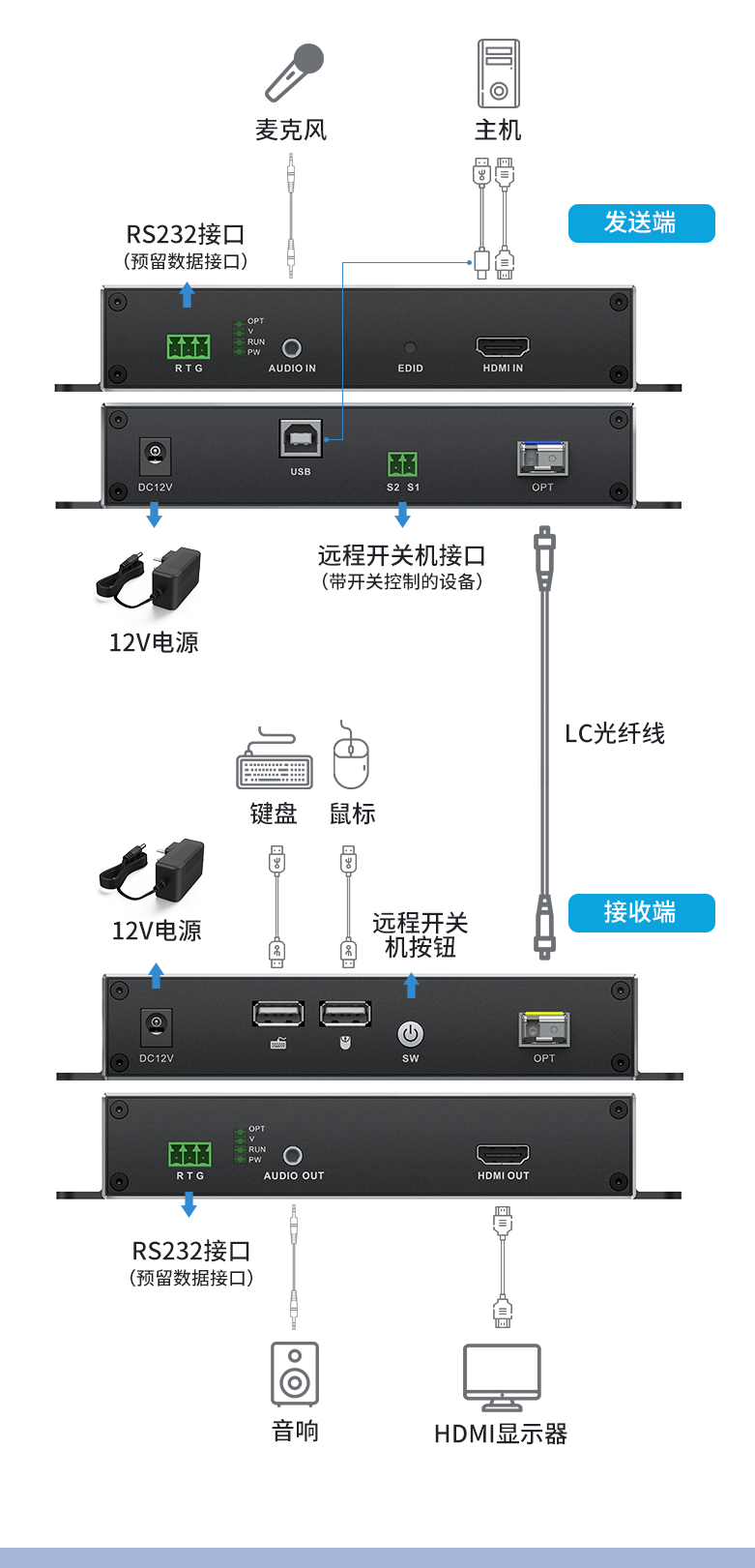 采用3G光模塊高速傳輸,音視頻同步傳輸鍵盤鼠標(biāo)功能,單纖傳輸0~20KM,性能可靠放心