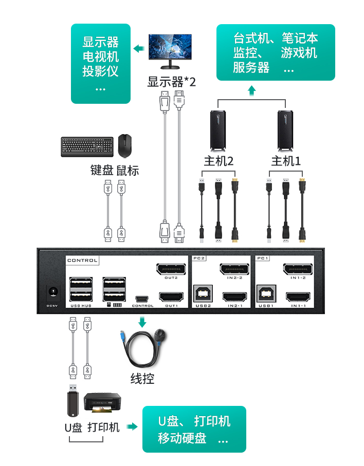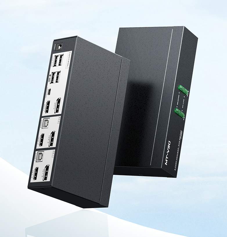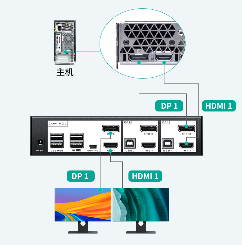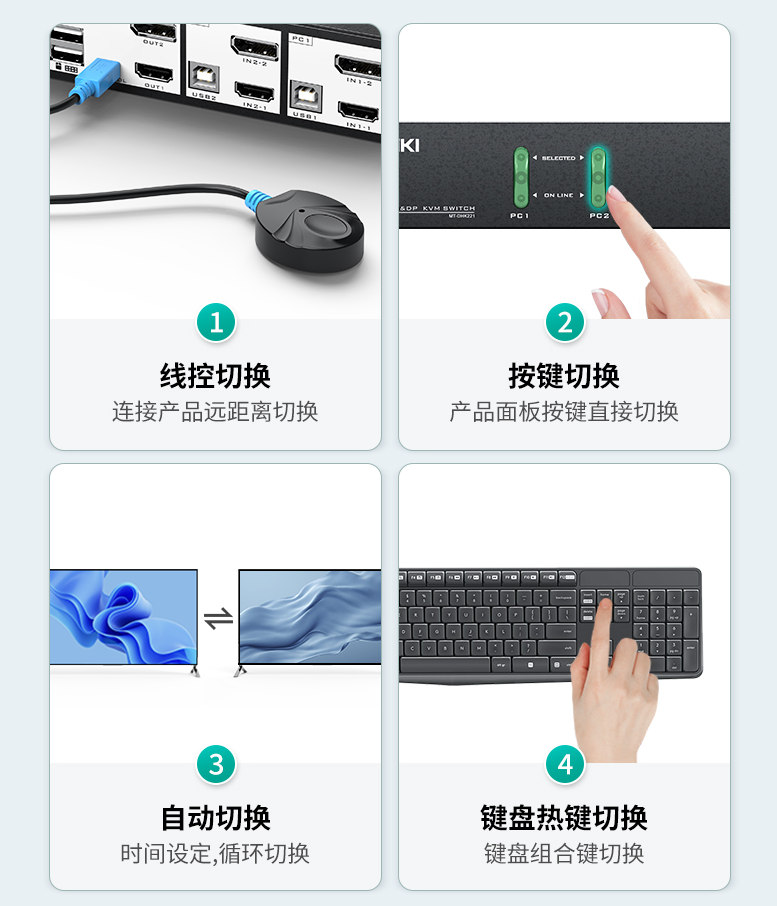 DP&HDMIKVM切換器是為了滿足市場上顯卡有HDMI輸出+DP信號輸出的電腦主機實現(xiàn)2臺電腦共用1套鍵盤鼠標(biāo)、2臺顯示器的需求:支持同一臺電腦主機HDMI接口與DP兩種接口同時使用,還能在同一臺主機上操作主屏、擴展屏,能極大的提高工作效率;本產(chǎn)品還支持多種切換模式,您可以通過面板按鍵切換、鍵盤熱鍵切換、自動掃描模式切換,桌面控制器切換等方式切換輸入端口。