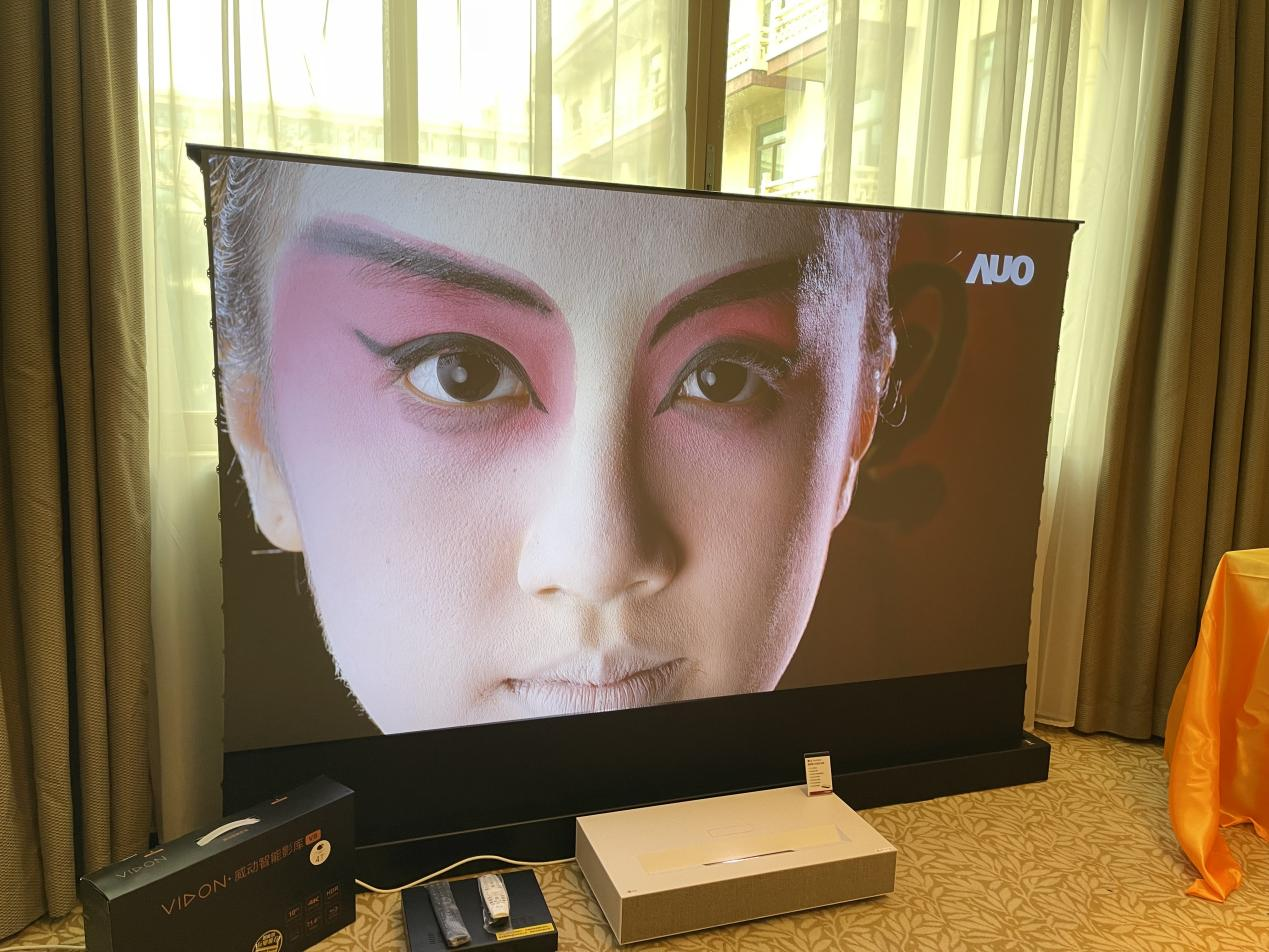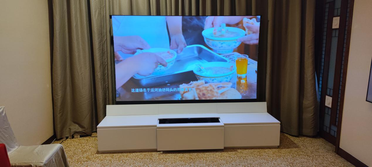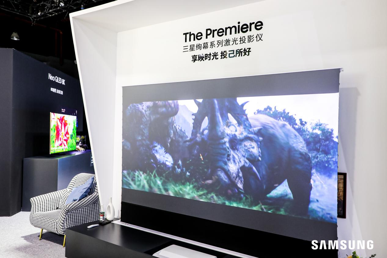 -SAMSUNG電視2022年戰(zhàn)略新品發(fā)布會(huì),圖片內(nèi)設(shè)備:三星P7激光電視&VIVIDSTORM黑柵地升幕