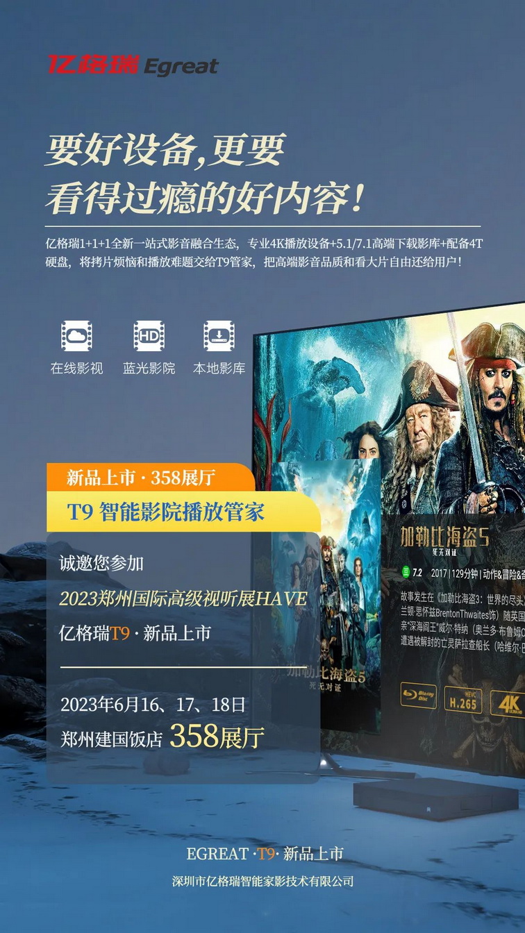 高端家庭影音將有新玩法?答案即將揭曉——HAVE鄭州國(guó)際高級(jí)視聽(tīng)展將于2023年6月16日至18日,在鄭州建國(guó)飯店盛大舉行,億格瑞T9智能影院播放管家即將亮相358展廳。
