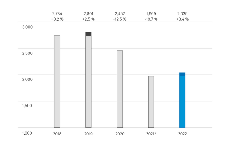 2022年,森海塞爾集團(tuán)總營(yíng)業(yè)額為5.074億歐元。其中,專業(yè)音頻解決方案業(yè)務(wù)部分,營(yíng)業(yè)額達(dá)到 4.677 億歐元, 2021 年消費(fèi)品業(yè)務(wù)也包含在銷售額中,約占總銷售額的一半,2022 年財(cái)報(bào)中仍包括其兩個(gè)月的銷售額。由于消費(fèi)品業(yè)務(wù)的變動(dòng),銷售額下降20.3%。