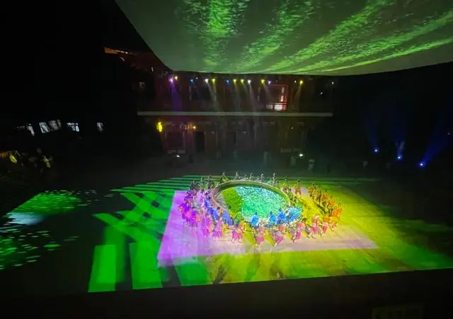 走近古老的神秘英雄史詩,品味別樣的文化視聽盛宴。中國首部苗族大型山水實(shí)景演出《西江盛典》,以貴州雷山大塘景區(qū)原始苗寨風(fēng)貌和周邊自然景觀為依托,由十余臺(tái)NEC女王系列4K雙色激光旗艦工程投影機(jī)聯(lián)袂呈現(xiàn)。隨著舞臺(tái)劇情的推進(jìn),在專業(yè)演員動(dòng)情演繹下,NEC女王系列點(diǎn)亮環(huán)形幕、圓形地面旋轉(zhuǎn)舞臺(tái)和巨型牛頭雕塑,傾力打造一場苗族歷史文化與投影科技完美融合的視覺奇觀。觀眾漫游其中,聆聽歷史典故與民間傳說,欣賞民風(fēng)民俗與人文景觀,沉浸式感受苗族文化風(fēng)情。