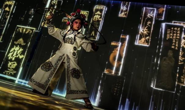 在光影盛宴主展區(qū),通過光影的勾勒,生動(dòng)展現(xiàn)徽派建筑的輪廓,逐步演繹徽派建筑的歷史演變過程。隨后,徽墨的制作過程徐徐展開,通過視聽與嗅覺,觀眾能夠感知到徽墨的香氣與品質(zhì)。畫面轉(zhuǎn)換,情節(jié)將以徽劇作為切入點(diǎn),從古畫中走進(jìn)現(xiàn)代舞臺(tái),引導(dǎo)觀眾進(jìn)入百里花園,感受績(jī)溪的自然之美。最后,影片用績(jī)溪四季時(shí)節(jié)的花開花落,向人們描繪了獨(dú)屬徽州的春夏秋冬:從梅花到油菜花;從金山時(shí)雨到杜鵑花;從荷花到向日葵;再從核桃林到蘭花……最終隨著雪花的飄落,白雪皚皚的績(jī)溪展現(xiàn)在觀眾面前。全展以多維視角表達(dá)引領(lǐng)觀眾感受績(jī)溪的人文底蘊(yùn)和自然之美,體驗(yàn)一場(chǎng)全沉浸式的光影盛宴。