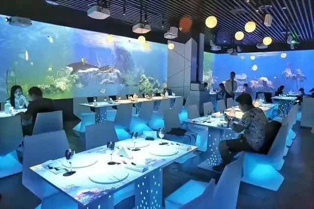 燈光、特效、光影與環(huán)境的完美交融,以及立體的畫面視覺效果,讓就餐者有一種置身于海底世界、浪漫花海、浩蕩無際的星空等場景中。
