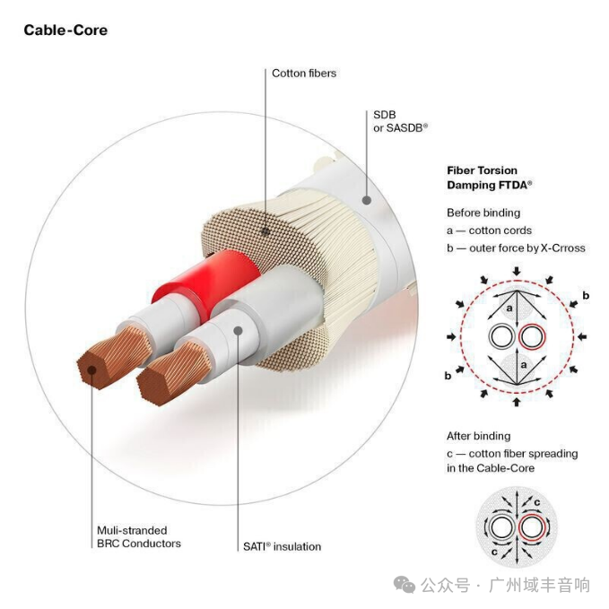 這項突破性技術(shù)是Tchernov高端Refrence和Ultimate系列線材的基礎(chǔ),Tchernov證明振動阻尼是一個關(guān)鍵參數(shù)。線材由兩根絕緣BRC導(dǎo)線與兩根較大直徑的填充棉線對稱絞合,并用絕緣膠帶在一致的壓力下緊固而成。該專利名為 FTDA®,全稱為Fiber Torsion Damping纖維扭轉(zhuǎn)阻尼,基于導(dǎo)體在粘性縱向纖維周圍自由浮動的原理,具有高機械衰減。