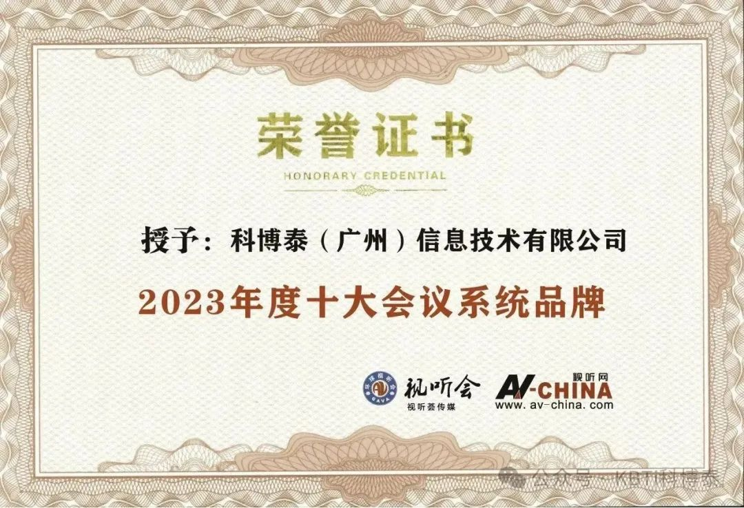 “2023年度金視聽(tīng)”榮譽(yù)評(píng)選經(jīng)過(guò)頭部企業(yè)家、相關(guān)兩院院士、行業(yè)專家、調(diào)研機(jī)構(gòu)負(fù)責(zé)人、世界視聽(tīng)大會(huì)專家智庫(kù)、專業(yè)視聽(tīng)協(xié)會(huì)負(fù)責(zé)人等權(quán)威人士組成的評(píng)審委員會(huì)進(jìn)行評(píng)審;評(píng)選結(jié)果揭曉于近日正式公布。科博泰(廣州)信息技術(shù)有限公司品牌(KBTi)再次榮獲“2023年度金視聽(tīng). 十大專業(yè)音響品牌”及“2023年度金視聽(tīng). 十大會(huì)議系統(tǒng)品牌”兩大殊榮。