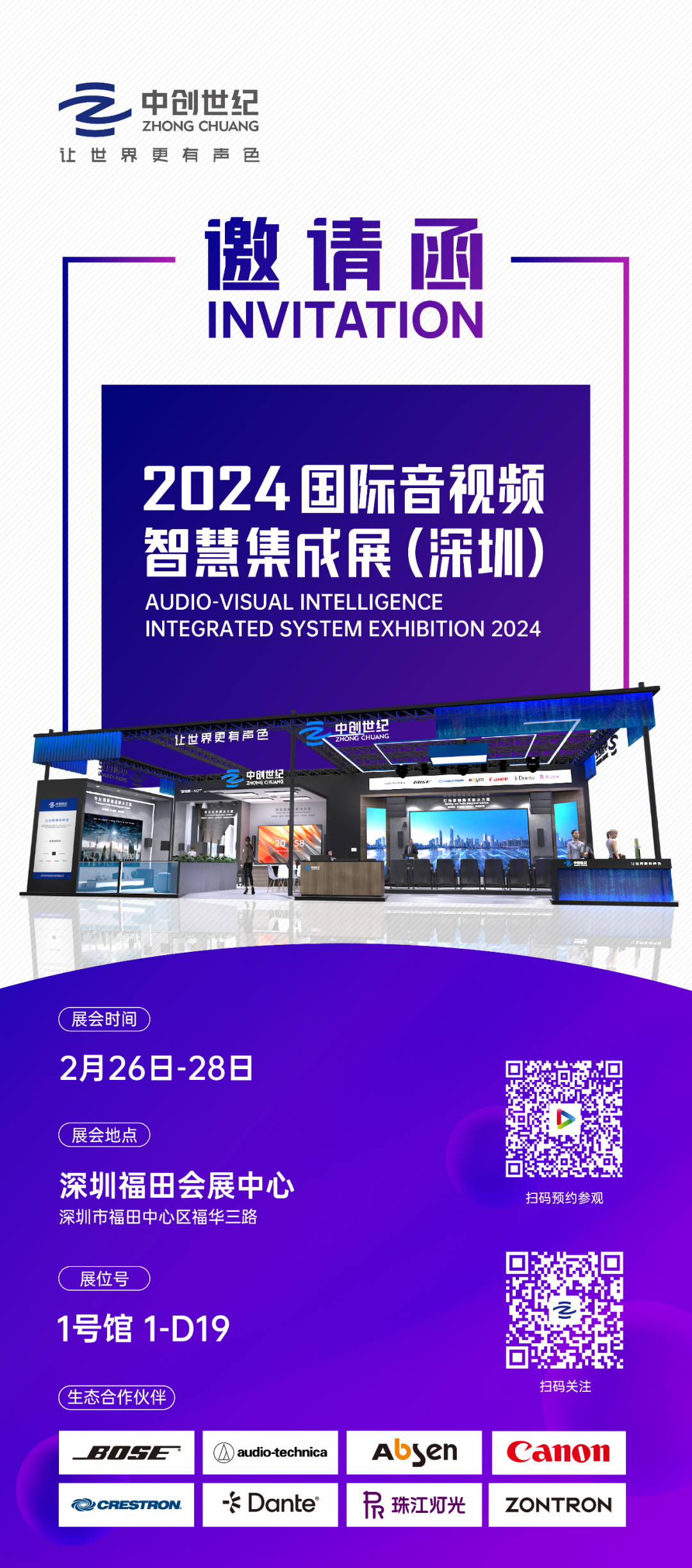中創(chuàng)世紀(jì)將攜生態(tài)合作伙伴再度參加“2024國(guó)際音視頻智慧集成展(深圳)”,向各位呈現(xiàn)全方位、一站式的音視頻產(chǎn)品及其系統(tǒng)集成解決方案,助力政企教等領(lǐng)域客戶(hù)打造更高效更智能的音視頻應(yīng)用場(chǎng)景體驗(yàn)!2024年2月26日-28日,誠(chéng)邀您蒞臨1-D19展位參觀(guān)交流!