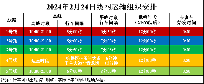 2月24日,2、3號線高峰時段由15:00-20:00調整至10:00-21:00,延長6小時;1、5號線高峰時段由10:00-20:00調整至10:00-21:00,延長1小時;4號線全天平峰。
