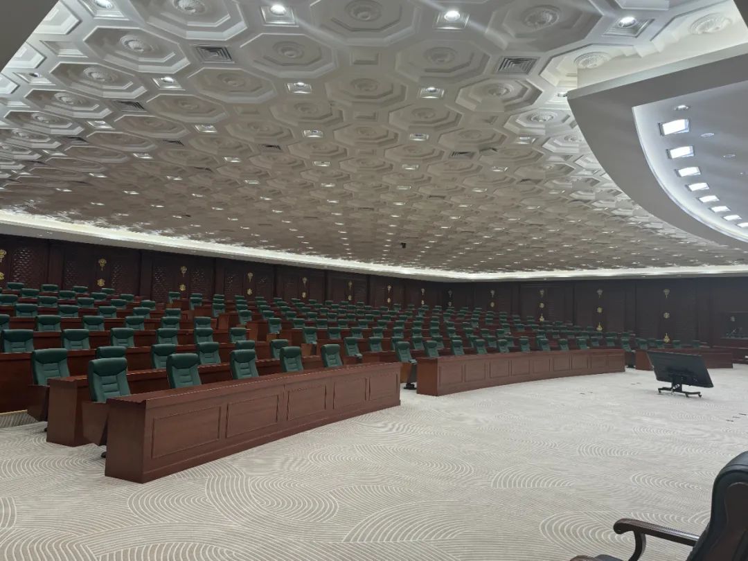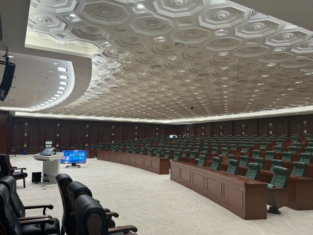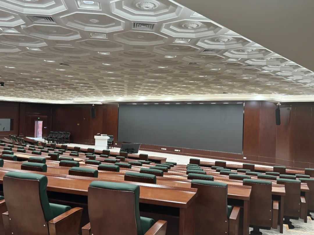國家行政學(xué)院多功能廳長32米,寬24米,層高約3.3米,座位采用階梯式布置,舞臺設(shè)置在教室的長邊,舞臺寬約16米,深4米。