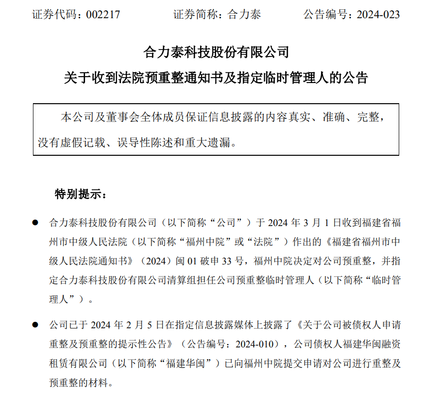 合力泰表示,福州中院決定對(duì)公司啟動(dòng)預(yù)重整,不代表福州中院正式受理公司重整。截至本公告披露日,公司尚未收到法院對(duì)公司重整事項(xiàng)的正式受理文書,債權(quán)人的重整申請(qǐng)是否被法院正式受理及進(jìn)入重整程序存在不確定性。關(guān)于啟動(dòng)預(yù)重整程序?qū)镜挠绊懀狭μ┓Q,公司進(jìn)入預(yù)重整程序后,將提前開展債權(quán)申報(bào)與審查、審計(jì)及資產(chǎn)評(píng)估、招募投資人等工作,并與廣大債權(quán)人等進(jìn)行溝通和征詢意見,全面掌握各方主體對(duì)重整事項(xiàng)的反饋意見和認(rèn)可程度,盡快制定可行性強(qiáng)的預(yù)重整方案,提高后續(xù)重整工作效率及重整成功率。如果公司預(yù)重整成功并順利實(shí)施重整,將有利于優(yōu)化公司資產(chǎn)負(fù)債結(jié)構(gòu),提升公司的持續(xù)經(jīng)營(yíng)及盈利能力,公司債權(quán)人對(duì)公司的債權(quán)將依法獲得清償。合力泰強(qiáng)調(diào),預(yù)重整為福州中院正式受理重整前的程序,不代表福州中院正式受理申請(qǐng)人對(duì)公司提出的重整申請(qǐng),公司是否能進(jìn)入重整程序尚存在不確定性。預(yù)重整期間,公司日常經(jīng)營(yíng)管理工作正常開展。據(jù)了解,合力泰作為智能終端核心 部件一站式服務(wù)商,主要產(chǎn)品包括:顯示類產(chǎn)品(OLED/TFT/TN/STN/ 電子紙等)、光電傳感類產(chǎn)品、FPC 柔性線路板及應(yīng)用產(chǎn)品等,產(chǎn)品應(yīng)用于智能手機(jī)、智能穿戴、智能零售、車載顯示、通用顯示、指紋門鎖等諸多應(yīng)用場(chǎng)景領(lǐng)域。此前,合力泰因虧損超百億的業(yè)績(jī)預(yù)告引發(fā)市場(chǎng)關(guān)注。預(yù)計(jì) 2023 年度歸屬于上市公司股東的凈利潤(rùn)為虧損 1,200,000 萬(wàn)元至 900,000 萬(wàn)元,報(bào)告期末歸屬于母公司所 有者權(quán)益為-651,000 萬(wàn)元至-351,000 萬(wàn)元。2月4日,合力泰公告稱,公司收到申請(qǐng)人福建華閩融資租賃有限公司(簡(jiǎn)稱“福建華閩”)的《告知函》,福建華閩以公司不能清償?shù)狡趥鶆?wù)并且資產(chǎn)不足以清償全部債務(wù),但仍具備重整價(jià)值,且具備與主要債權(quán)人開展自主談判的能力為由,已向福州中院提交申請(qǐng)對(duì)公司進(jìn)行重整及預(yù)重整的材料。公告顯示,福建華閩是合力泰的融資租賃業(yè)務(wù)的出租方,與公司及控股子公司簽訂多份《融資性售后回租合同》,合同項(xiàng)下的金額尚未結(jié)清。截至《告知函》出具日,公司及控股子公司尚未付清福建華閩總租金余額合計(jì)1.37億元,其中逾期未付7902.18萬(wàn)元人民幣。