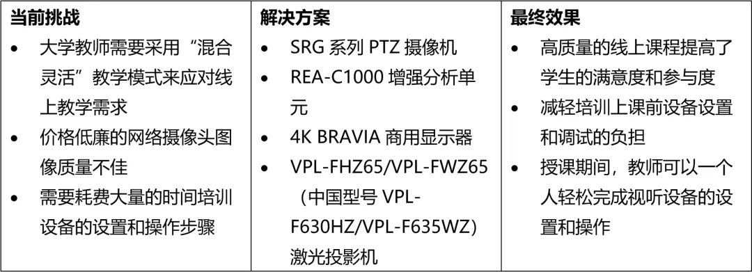 “我們非常滿意這套用索尼產(chǎn)品打造的混合式教學(xué)方案。一開始只有三個教室使用這套方案,后來我們以此為標(biāo)準(zhǔn),增加了使用的教室數(shù)量。”