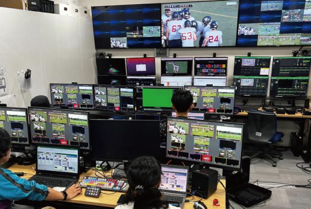 正在直播的遠程中心的景象。當(dāng)天在來自多個比賽場地的影像中進行了包含字幕插入、CM(廣告)插播等操作的節(jié)目制作。