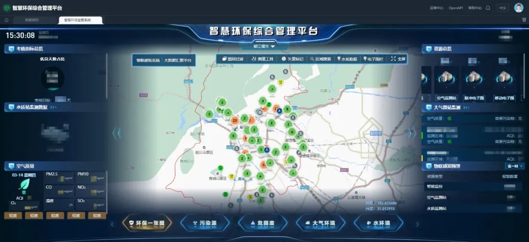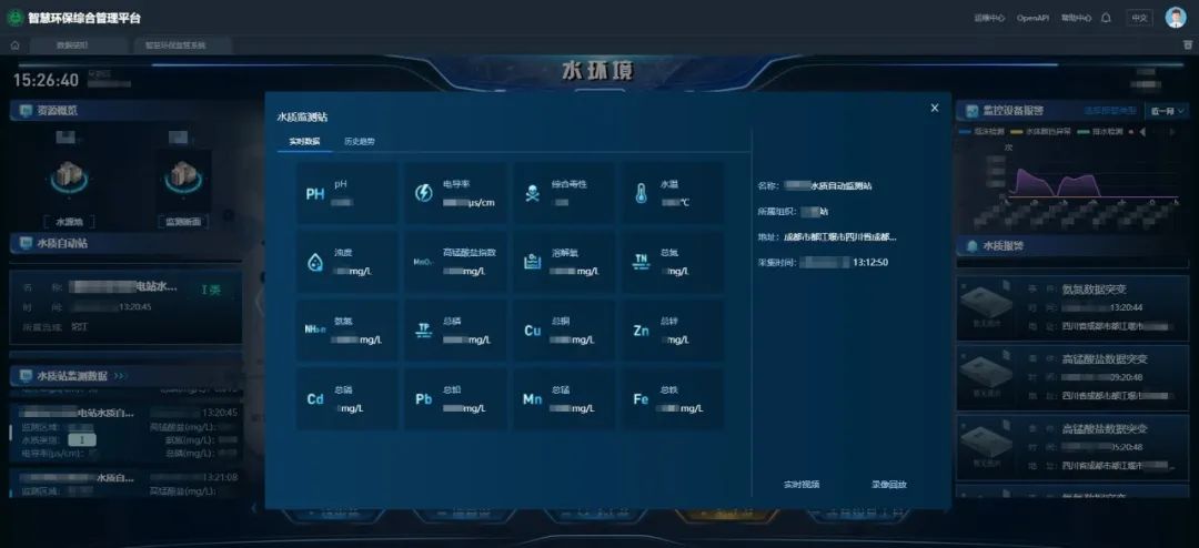 通過水質(zhì)監(jiān)測站、大氣監(jiān)測站等,水環(huán)境能基于各項數(shù)據(jù)更科學地展現(xiàn),管理中心統(tǒng)一匯聚、整合多方數(shù)據(jù)資源并地圖可視化展示,使得內(nèi)場運維人員可以在一個系統(tǒng)上完成對水環(huán)境各項指標的快速巡檢,及時了解區(qū)域內(nèi)的水質(zhì)情況。